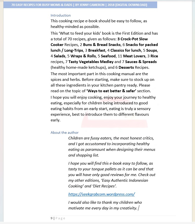 A total of 70 recipes given: 3 Crock-Pot Slow Cooker Recipes, 2 Buns & Bread Snacks, 6 Snacks for packed lunch / Long-Trips, 3 Breakfast, 4 Classics for lunch, 5 Soups, 4 Salads, 5 Wraps & Rolls, 5 Seafood, 11 Meat Lovers, 3 Rice recipes, 7 Tasty Vegetables Medley and 7 Sauces & Spreads (healthy home-made ketchups), and 6 Desserts Recipes. Eating is truly a sensory experience, best to introduce them to different flavours early.